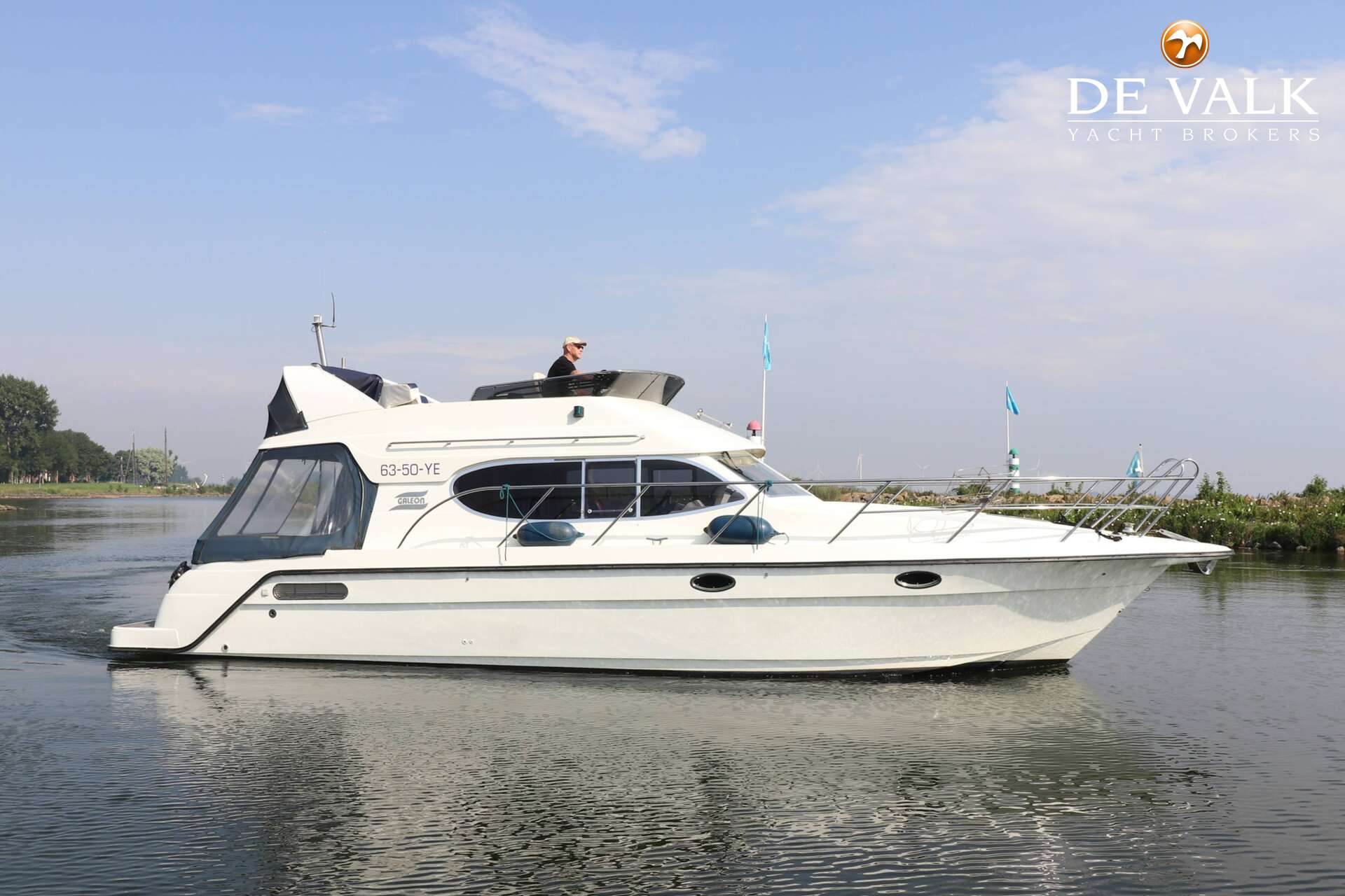 Galeon 380 FLY "Gakima" built in 2000 by the P.P.H.U. GALEON shipyard in Gdansk. Easy handling due her Twin Volvo Penta diesel engines and bow thruster. Two cabins and bathroom (shower/washbowl/toilet), galley, saloon, cockpit, and flybridge with helmposition and sunbed. Furthermore equipped with a Victron battery charger and inverter and Scheppach generator. This motor yacht is not located in our sales marina, viewing possible by appointment,
