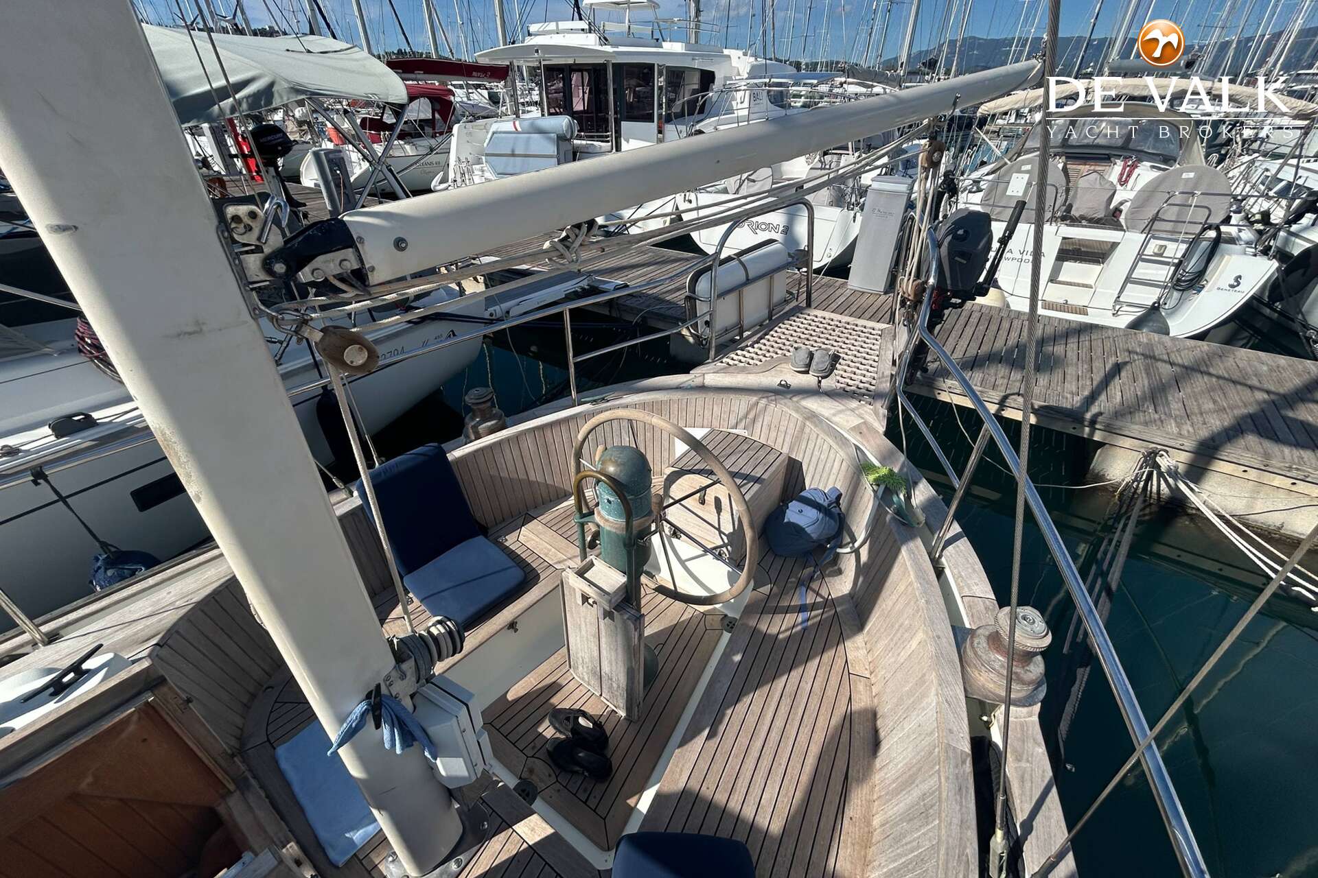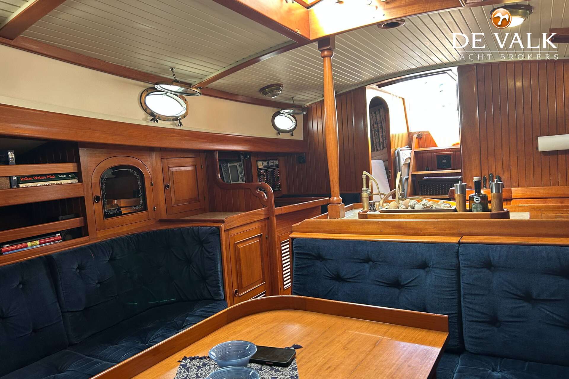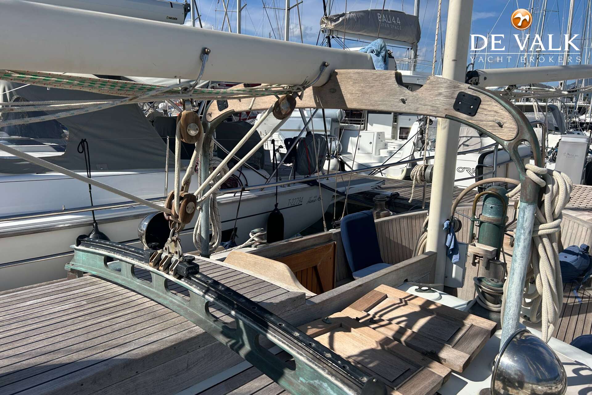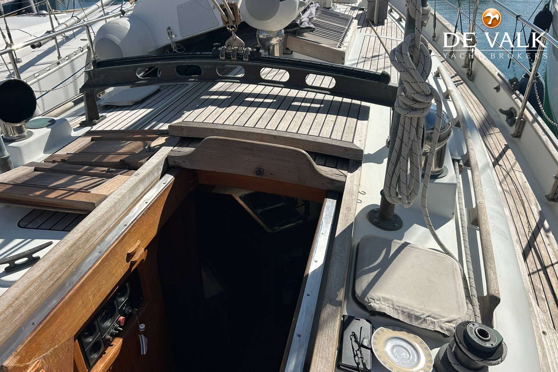 Cutter rigged ketch with various sails and Lewmar winches, and offers accommodation for 8 people in double and single cabins. This yacht is crafted with a fiberglass hull and features solid teak woodwork and bronze fittings. It is equipped with a long keel and a 66 hp Yanmar diesel engine, overhauled in 2021