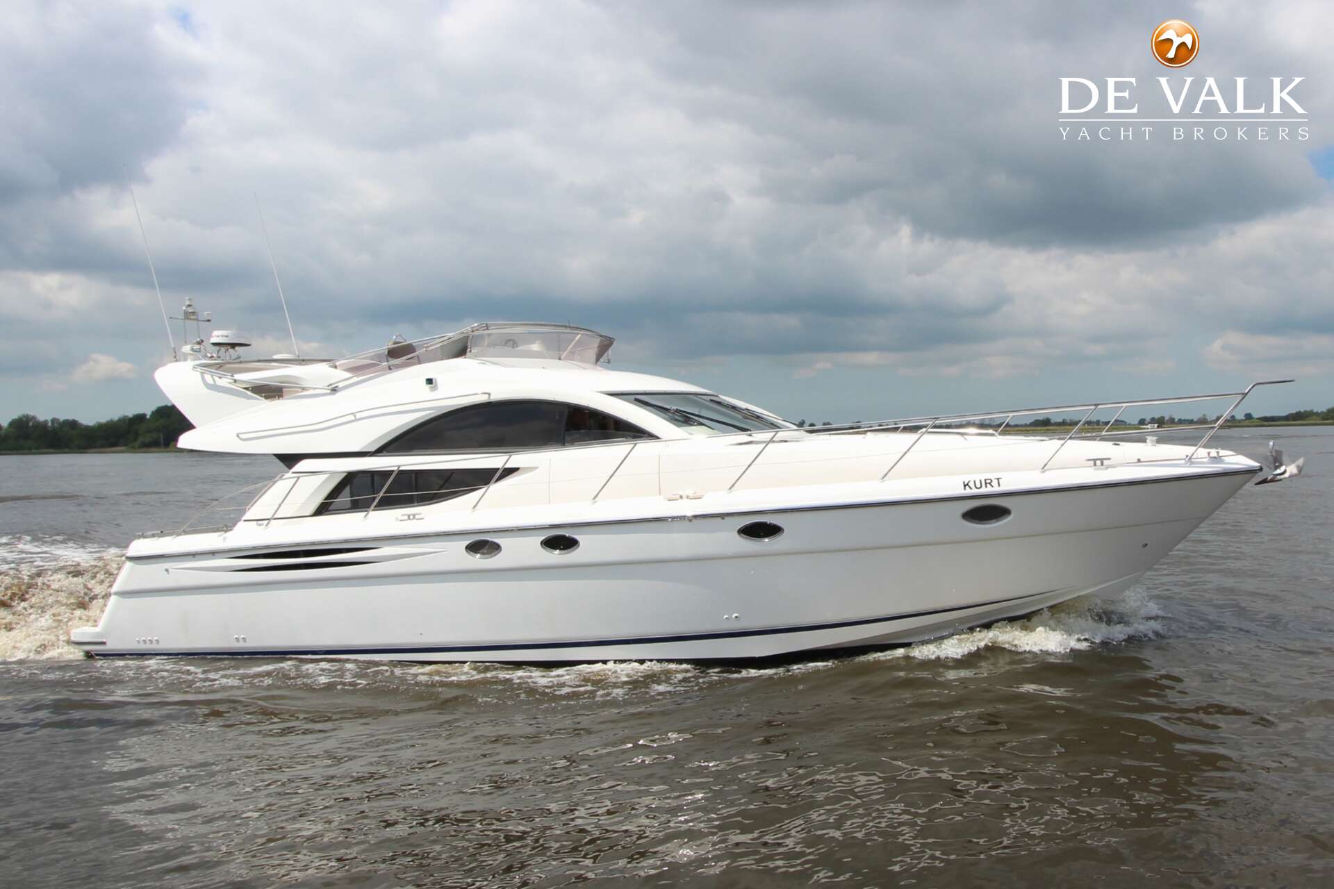 The Fairline Phantom 50 "Kurt" was built at Fairline Boats in 2003 and is equipped with four cabins, one of which is a crew cabin. Has two bathrooms, three toilets, 2 x Volvo Penta diesel engines of 675 hp each and a Sidepower bow thruster and an Onan generator 17.5 Kw. On the spacious flybridge you can enjoy the beautiful view and you have an outside bar. The current owner has given both engines a service. If you want to view this Fairline Phantom 50, it is located in the covered sales harbor in Sneek.