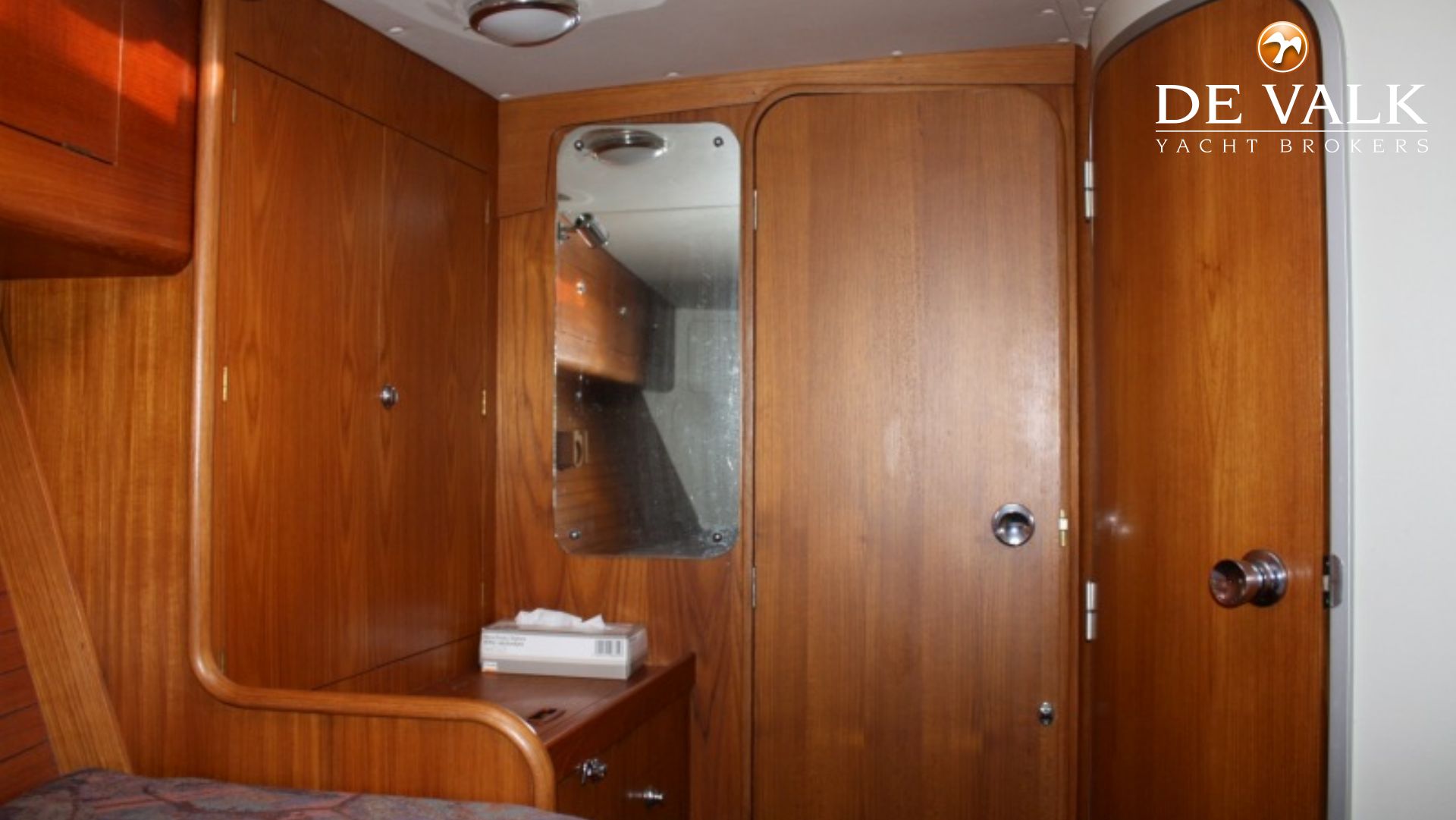 generous lockers under berths, stowage lockers around ship's sides, ample hanging locker space plus dresser and drawer space.