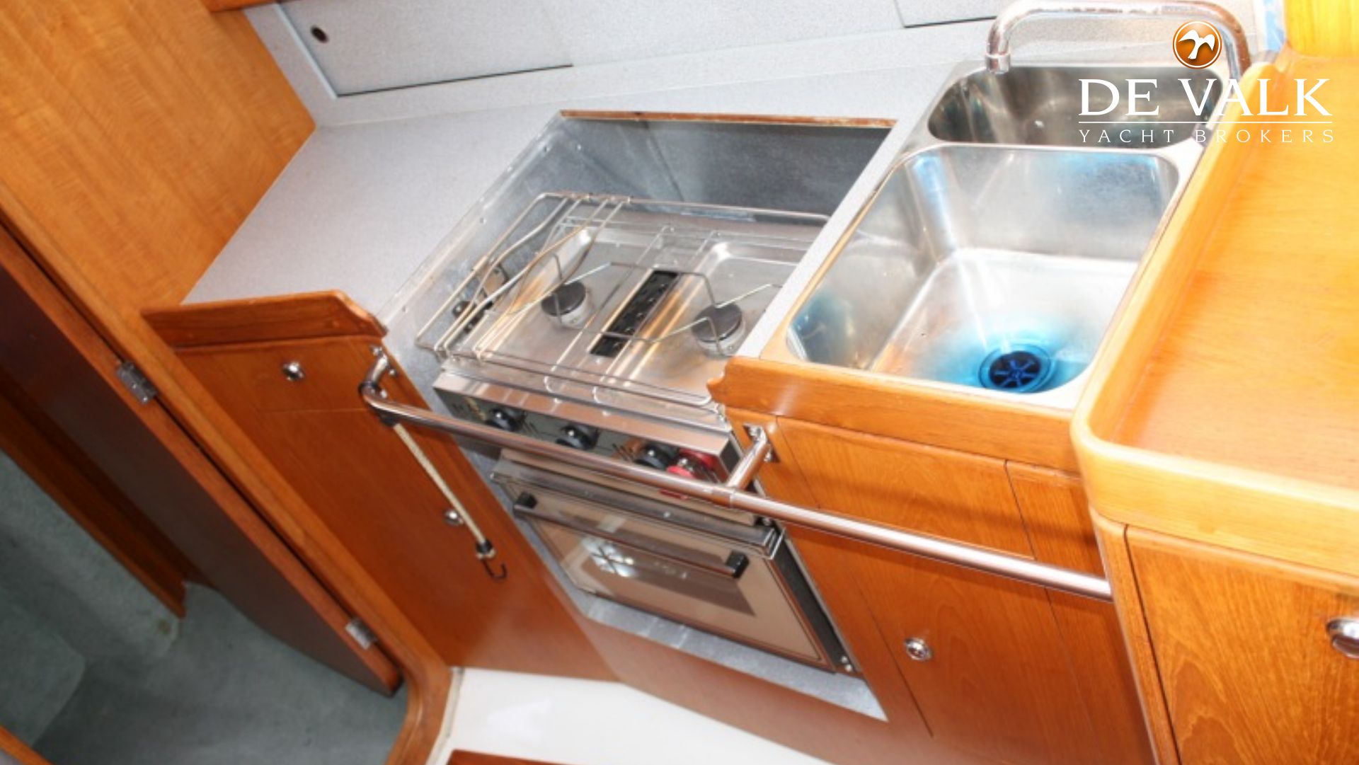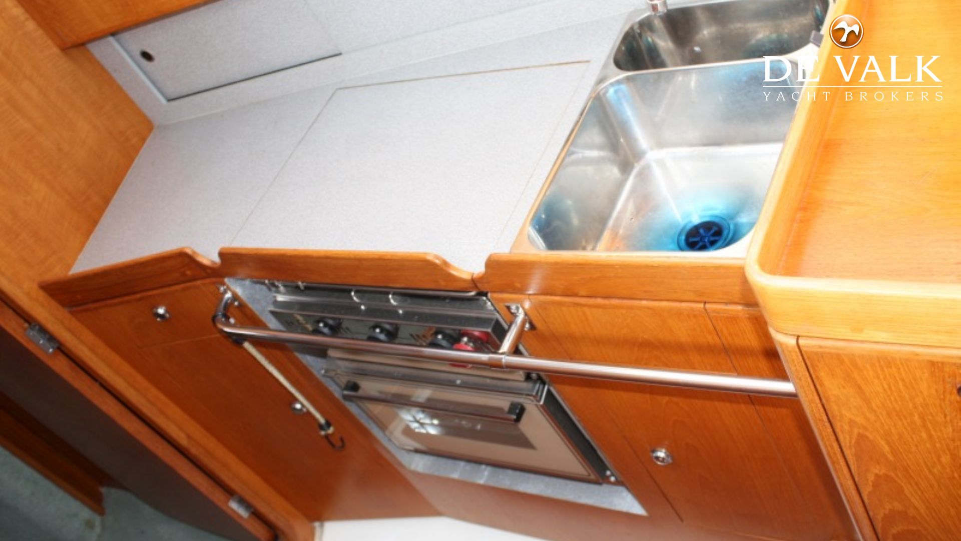 fitted out in teak with wipe-clean laminate worktops, fully fitted with twin stainless steel sinks, one with chopping board cover, gimbaled two burner gas cooker with oven and grill, stainless steel crash bar and fold away work top, front opening electric refrigerator, ample stowage in lockers and drawers, opening hatch set flush in deck head.