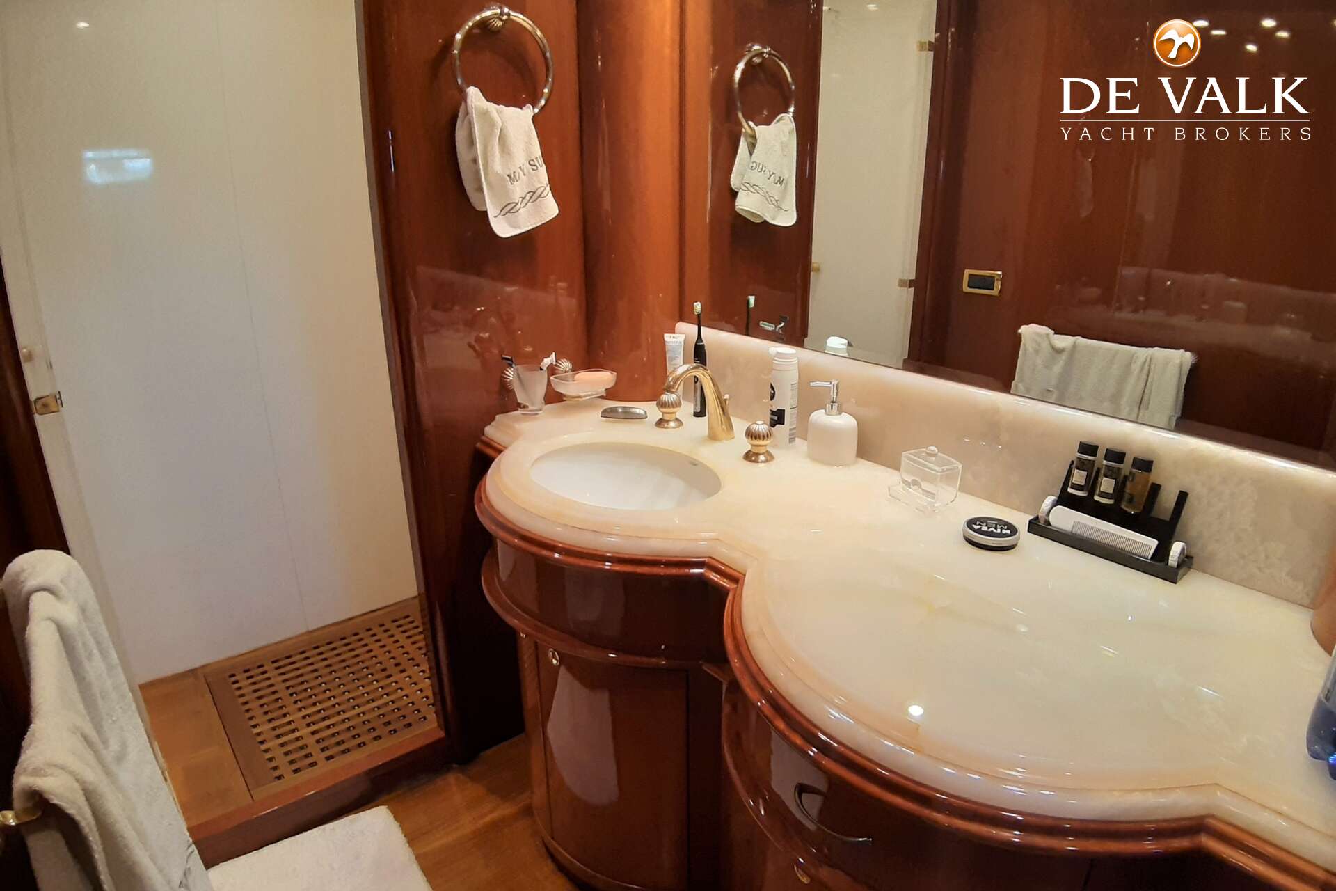 The yacht’s 6 bathrooms are truly exceptional, featuring intricate inlaid marquetry & exquisite mother-of-pearl marble surfaces-details that elevate comfort into a refined luxury experience.