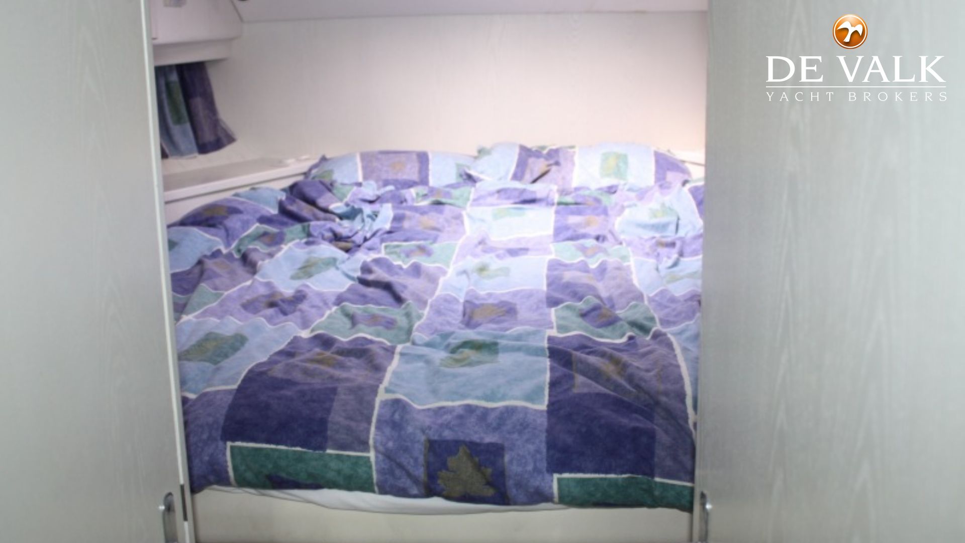Large aft cabin with large diagonal double berth to port, dresser, wardrobe with mirrored doors, lots of cupboards. En suite head to starboard with electric sea discharge WC, wash basin, hot &cold pressure water, storage lockers and separate shower stall.