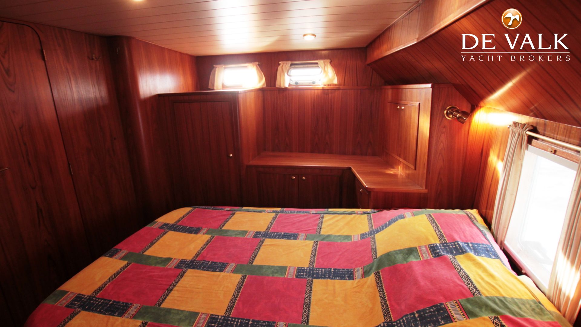 Familycruiser met kersenhouten interieur. Ruime eigenaarshut met Frans bed, aparte douche en toilet. Gastenhut met twee een persoons bedden. Ruime salon met een goed uitgeruste keuken.